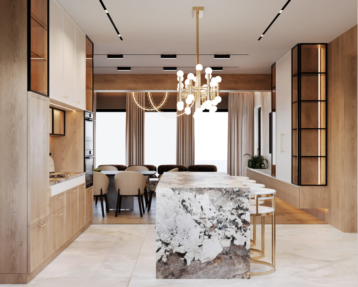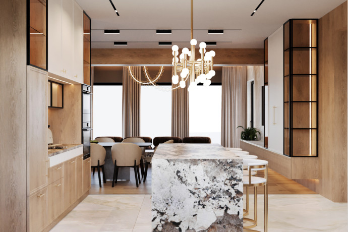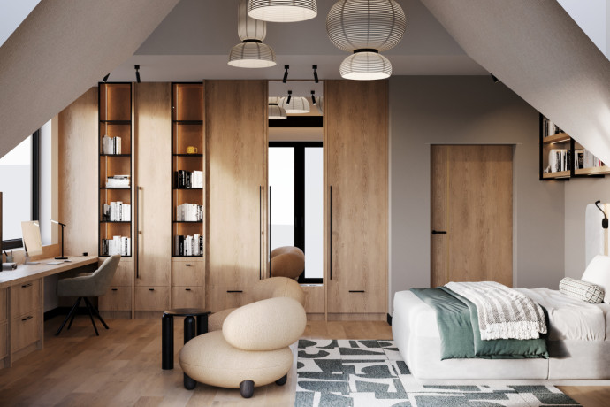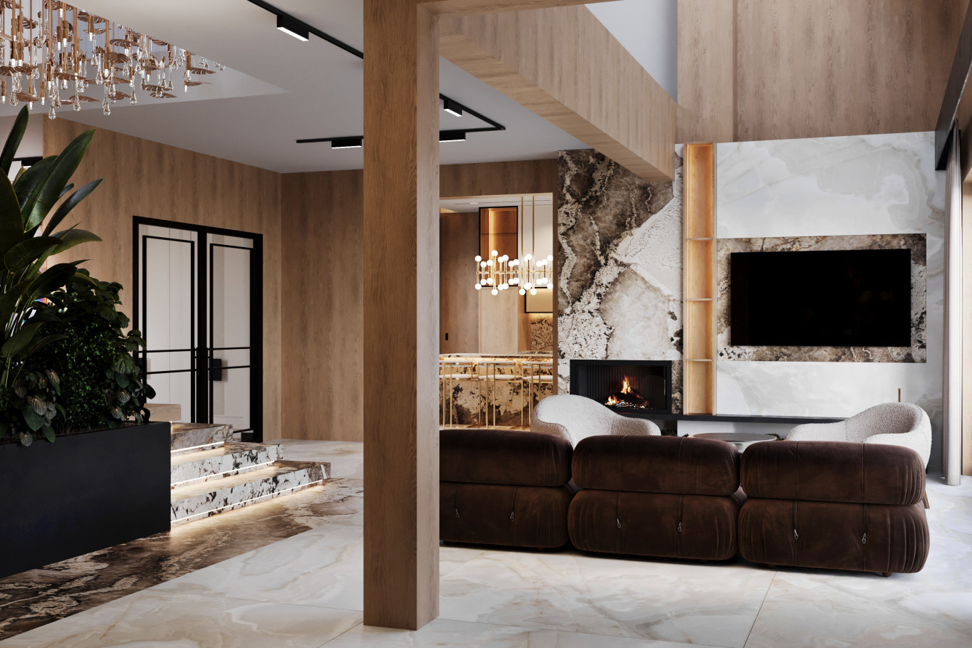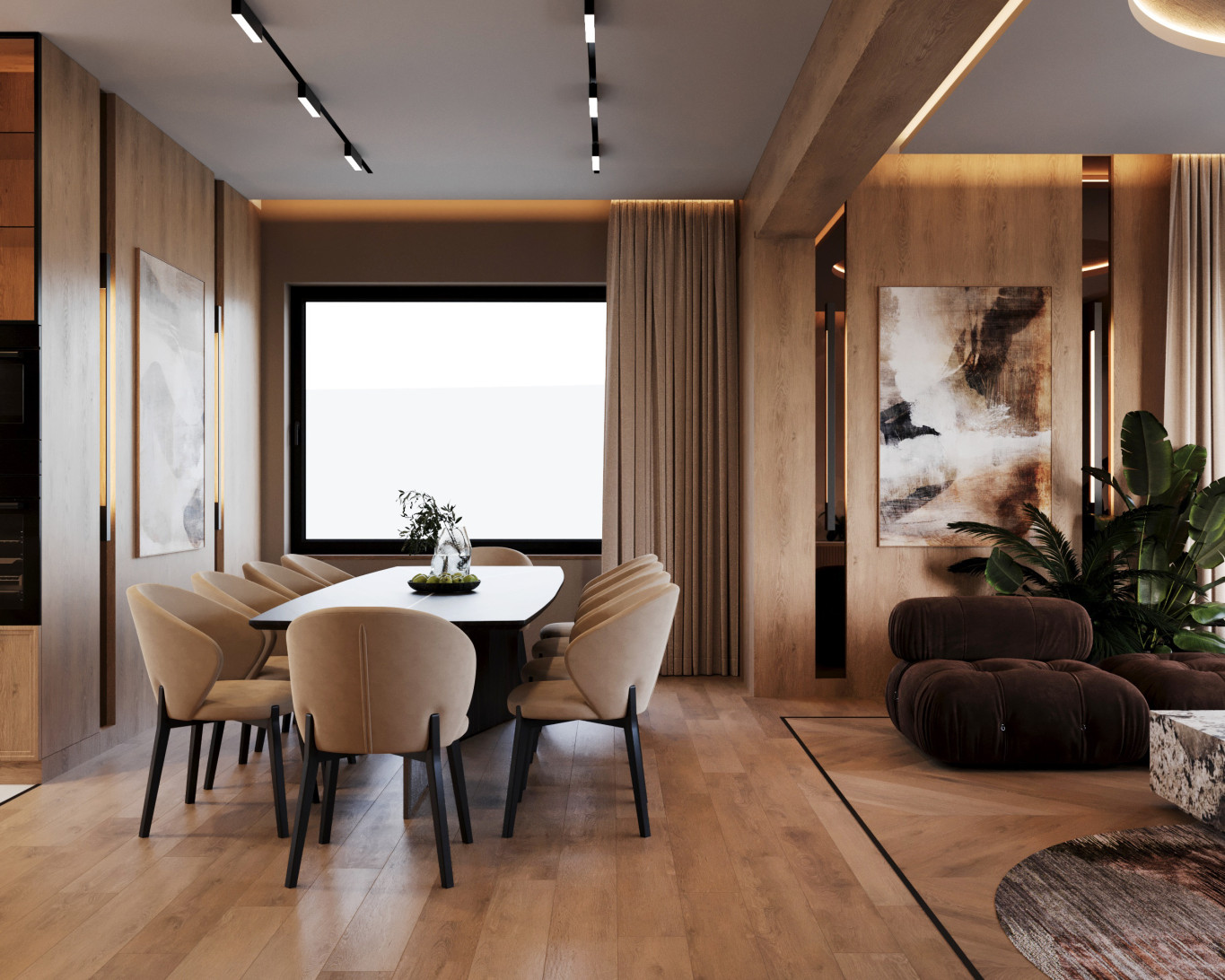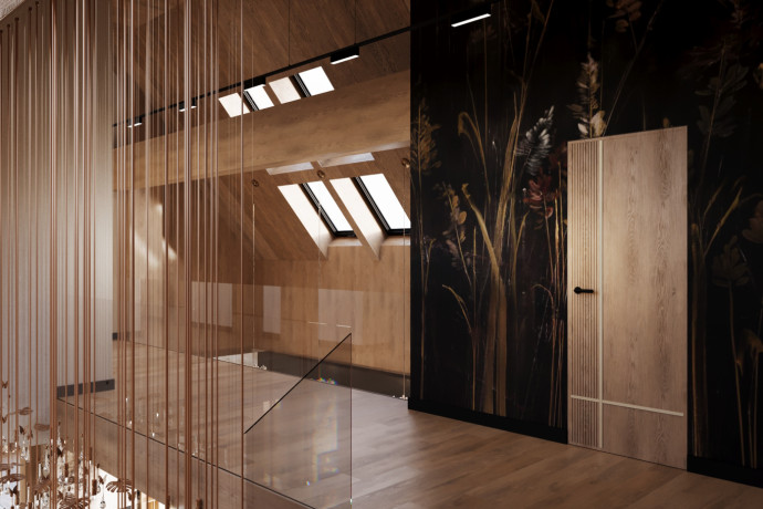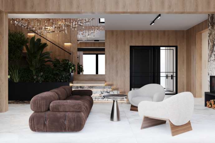 W tym projekcie kluczową rolę odgrywają materiały, światło i detal. To wnętrze stworzone z myślą o codziennym komforcie, ponadczasowej estetyce i designie. Każde z pomieszczeń ma swój unikalny charakter, designerskie lampy podkreślają eleganckich styl wnętrz. Kamienne akcenty, dodają wyrafinowanego uroku, przełamując przytulność drewna.