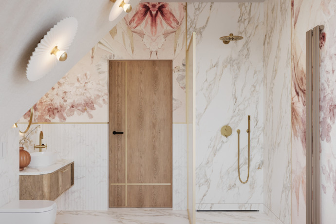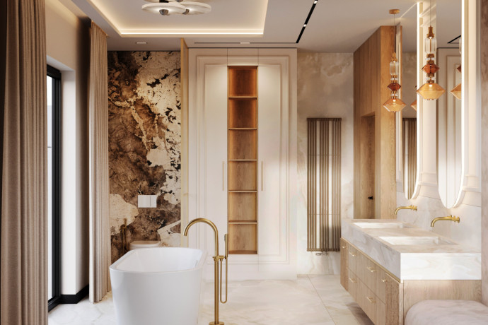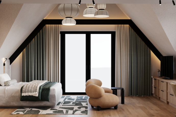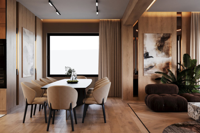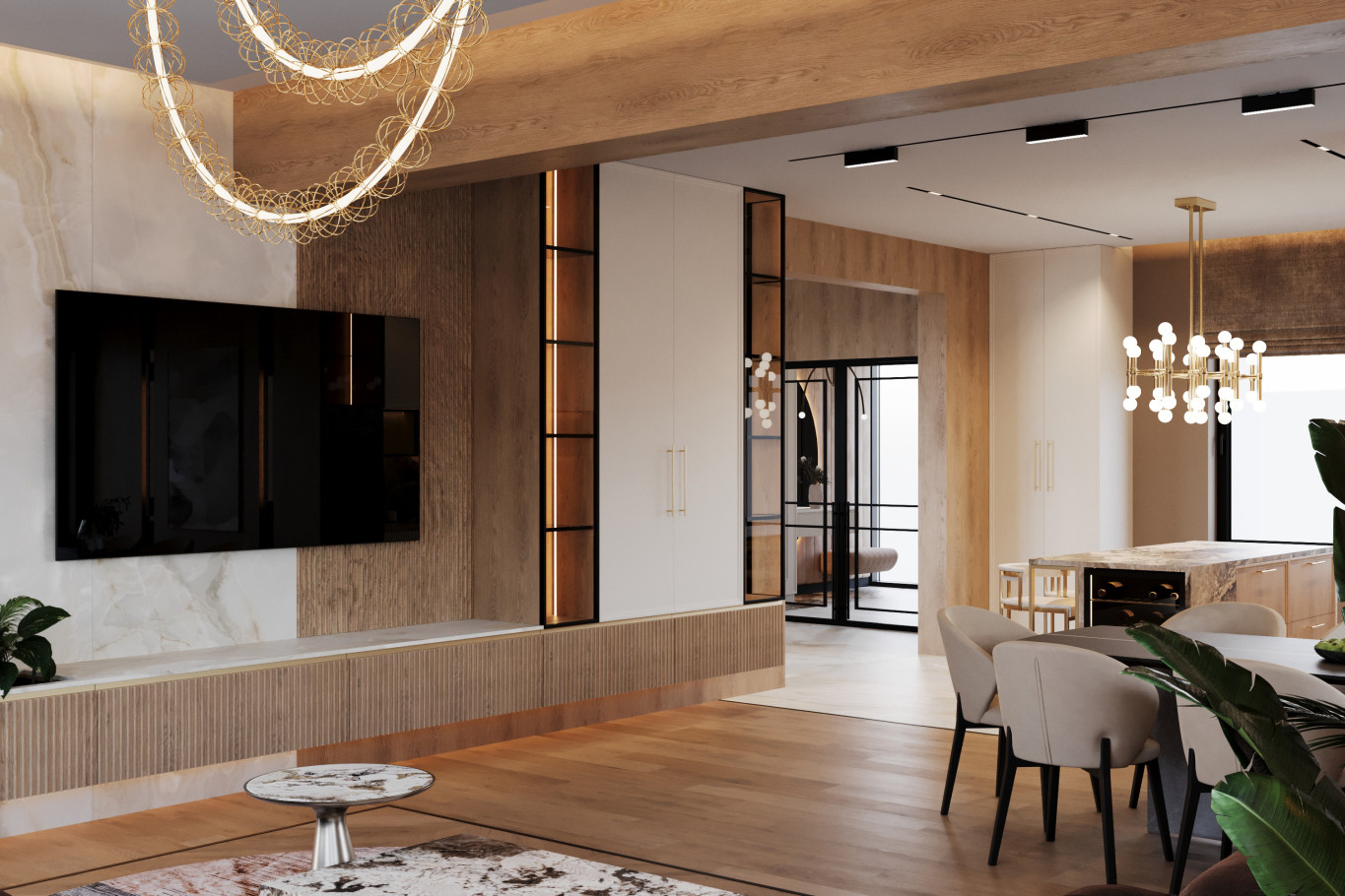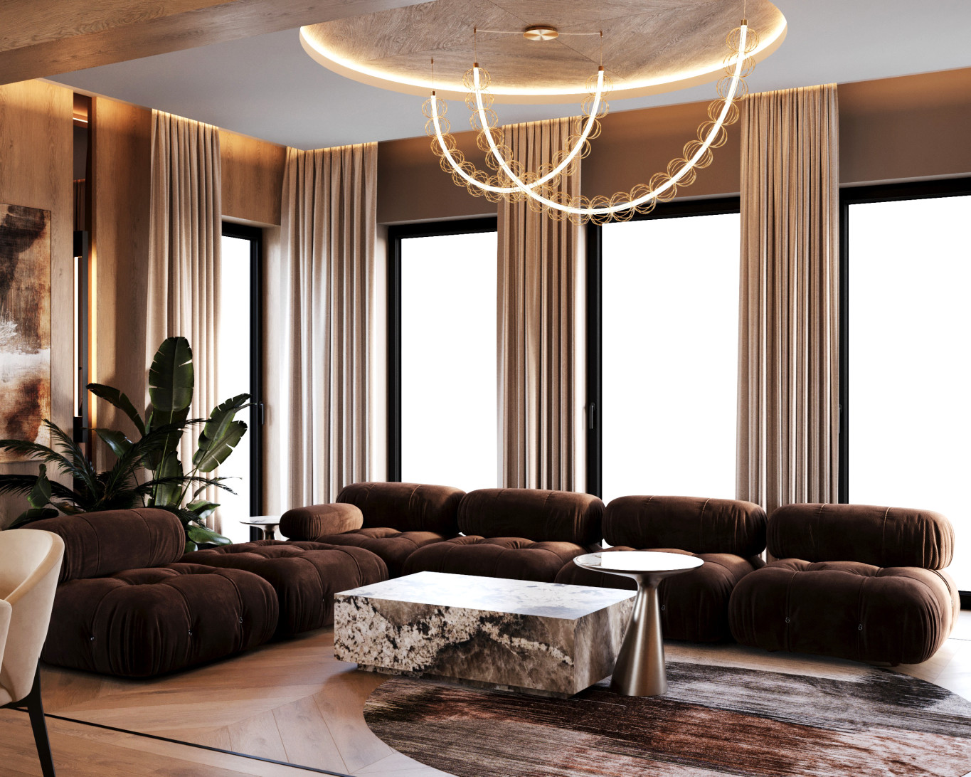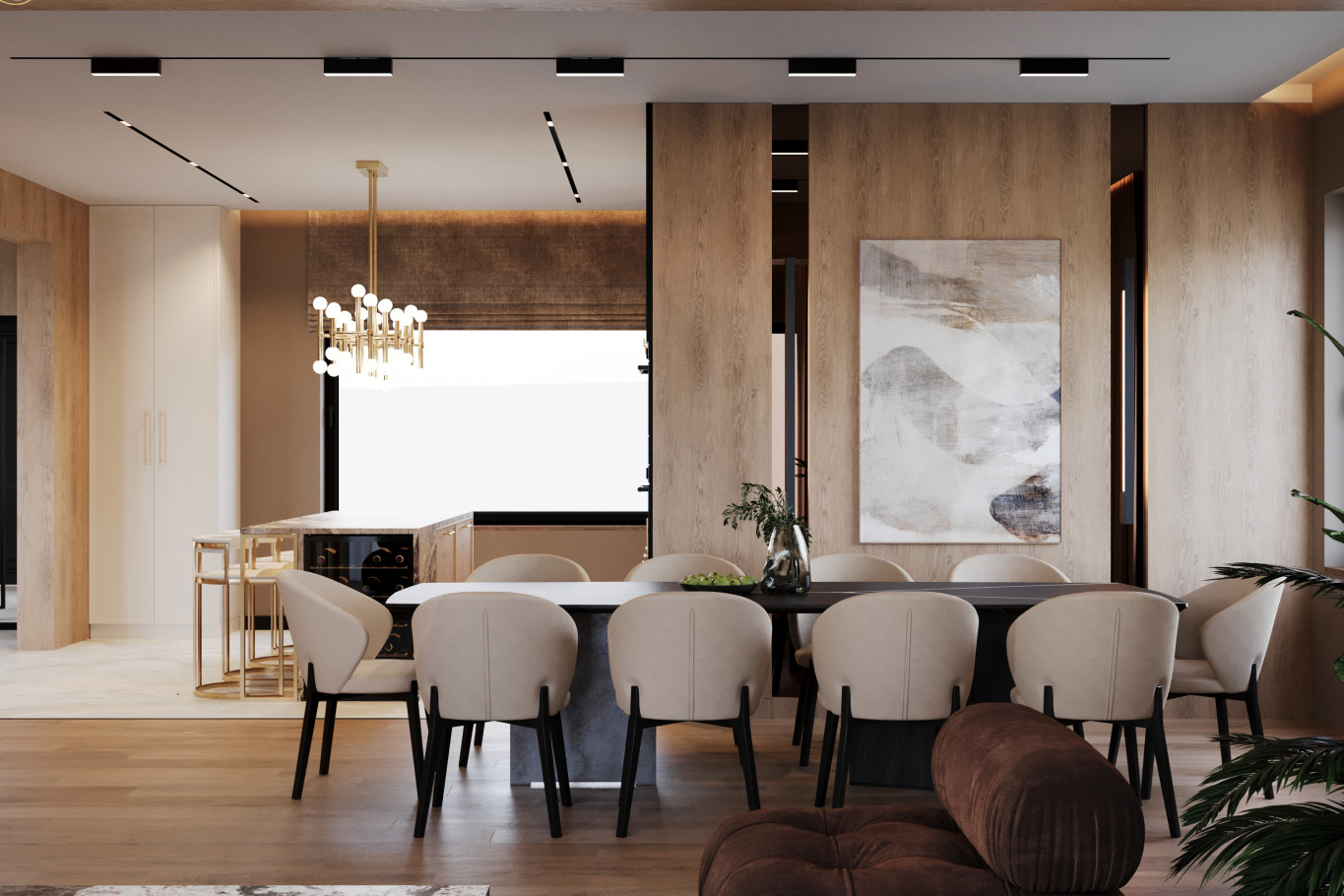 W tym projekcie kluczową rolę odgrywają materiały, światło i detal. To wnętrze stworzone z myślą o codziennym komforcie, ponadczasowej estetyce i designie. Każde z pomieszczeń ma swój unikalny charakter, designerskie lampy podkreślają eleganckich styl wnętrz. Kamienne akcenty, dodają wyrafinowanego uroku, przełamując przytulność drewna.